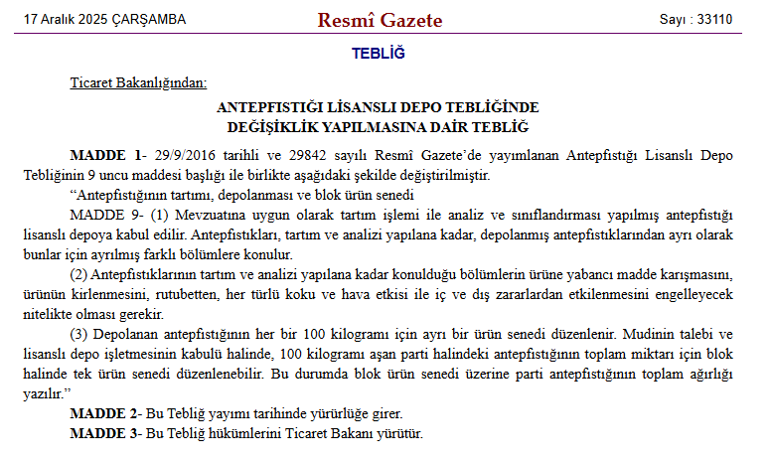 | Çevrimiçi ![]() ![]() ![]() | Antep fıstığında ürün senedi düzeni değişti: Blok senet dönemi başlıyor Ticaret Bakanlığı tarafından Antep Fıstığı Lisanslı Depo Tebliği’nde değişiklik yapıldı. Değişiklik, 17 Aralık 2025 Çarşamba tarihli ve 33110 sayılı Resmî Gazete’de yayımlanarak yürürlüğe girdi.İlginizi ÇekebilirANTEP FISTIĞI LİSANSLI DEPO TEBLİĞİ’NDE DEĞİŞİKLİK Yeni düzenlemeyle, antep fıstığının tartımı, depolanması ve blok ürün senedi süreçlerine ilişkin usul ve esaslar yeniden belirlendi. Buna göre, mevzuata uygun olarak tartımı yapılan ve analiz ile sınıflandırması tamamlanan antep fıstığı, lisanslı depo işletmeleri tarafından kabul edilecek. Tartım ve analiz işlemleri tamamlanana kadar ise antep fıstıkları, depolanmış ürünlerden ayrı bölümlerde muhafaza edilecek. Tebliğde, bu bölümlerin ürüne yabancı madde karışmasını, ürünün kirlenmesini, rutubeti, her türlü koku ve hava etkisini ile iç ve dış zararlardan etkilenmesini önleyecek nitelikte olması gerektiği vurgulandı. Ayrıca depolanan antep fıstığının her 100 kilogramı için ayrı bir ürün senedi düzenlenmesi esas alındı. Mudinin talebi ve lisanslı depo işletmesinin kabulü halinde, 100 kilogramı aşan parti ürünler için toplam miktarı kapsayan blok ürün senedi düzenlenebilecek. Bu durumda, blok ürün senedinde parti antep fıstığının toplam ağırlığı yer alacak. PİYASA İŞLEMLERİNİ HIZLANDIRICI UYGULAMA İLETİCARET KOLAYLAŞACAK Büyük üretici ve tüccarlar için avantajlı görülen bu sistemde 100 kiloyu aşan ürünler için tek tek senet yerine blok ürün senedi alınabilecek. Bu da daha az bürokrasi, daha hızlı işlem, daha düşük operasyon maliyeti demek. Tebliğ hükümlerini Ticaret Bakanı yürütecek. ![]() Konut kredisi faizlerinde yeni indirim! Kamu bankasından ilk adım geldi: İşte en düşük oran Kaynak ; Milliyet |