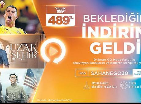 Binlerce içeriğin, popüler ve bir döneme damgasını vuran dizilerin, sevilen çocuk yapımlarının, spor karşılaşmalarının ve kaliteli yabancı dizi ve filmlerin tek platformda toplandığı D-Smart GO Mega Paket, 20-30 Kasım arasında web’e özel kampanya ile yıllık 699 lira yerine sadece 489 lira! Kampanyadan yararlanmak isteyenler, web’den yapacakları üyelik işlemleri sırasında “Promosyon kodum var” adımında ‘SAHANEGO30’ kodunu girerek, indirimden faydalanabilecek.
