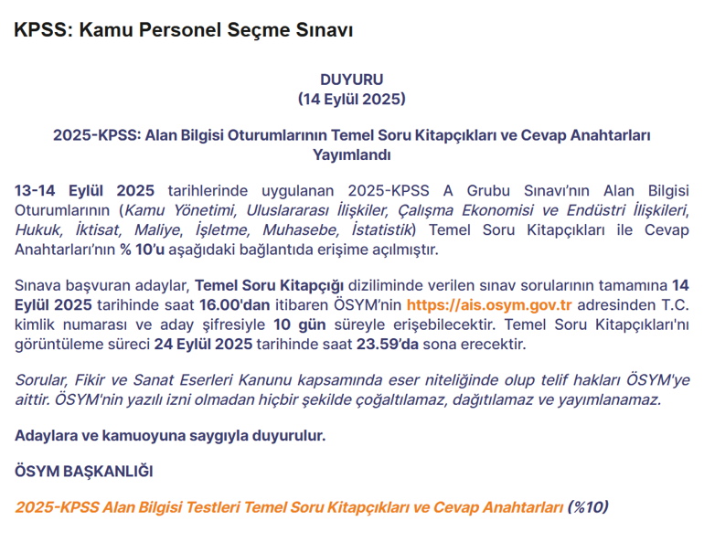 | Çevrimiçi ![]() ![]() ![]() | KPSS Alan Bilgisi soru kitapçığı ve cevap anahtarı yayımlandı Kamu Yönetimi, Uluslararası İlişkiler, Çalışma Ekonomisi ve Endüstri İlişkileri, Hukuk, İktisat, Maliye, İşletme, Muhasebe ve İstatistik testlerine ait soruların bir bölümü ÖSYM'nin internet sitesinde yayımlandı.Sınava katılan adaylar ise soru kitapçıklarının tamamına 14 Eylül 2025 saat 16.00'dan itibaren ais.osym.gov.tr adresinden T.C. kimlik numarası ve aday şifreleriyle ulaşabilecek. Kitapçıkların erişime açık kalma süresi 24 Eylül 2025 saat 23.59'da sona erecek. ÖSYM ayrıca, sınav sorularının telif hakkının kendilerine ait olduğunu hatırlatarak izinsiz çoğaltılamayacağı, dağıtılamayacağı ve yayımlanamayacağını vurguladı. İlginizi Çekebilir ![]() Kaynak ; Milliyet |