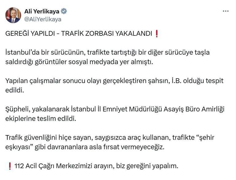 | Çevrimiçi ![]() ![]() ![]() | Görüntüler tepki çekmişti! Bakan Yerlikaya paylaştı: Trafik zorbası yakalandı Sosyal medyada İstanbul'da bir sürücünün, trafikte tartıştığı bir diğer sürücüye taşla saldırdığı görüntüler sonrası harekete geçildi. İçişleri Bakanı Ali Yerlikaya şahsın tespit edildiğini ve yakalandığını duyurdu.İlginizi ÇekebilirBakan Yerlikaya yaptığı paylaşımda şu ifadeleri kullandı: İstanbul'da bir sürücünün, trafikte tartıştığı bir diğer sürücüye taşla saldırdığı görüntüler sosyal medyada yer almıştı. ![]() Yapılan çalışmalar sonucu olayı gerçekleştiren şahsın, İ.B. olduğu tespit edildi. Şüpheli, yakalanarak İstanbul İl Emniyet Müdürlüğü Asayiş Büro Amirliği ekiplerine teslim edildi. Trafik güvenliğini hiçe sayan, saygısızca araç kullanan, trafikte "şehir eşkıyası" gibi davrananlara asla fırsat vermeyeceğiz. 112 Acil Çağrı Merkezimizi arayın, biz gereğini yapalım. Yer: Diyarbakır! Arazilerinden geçen yolu kapattılar! "Bu cadde bizimdir" Kaynak ; Milliyet |
